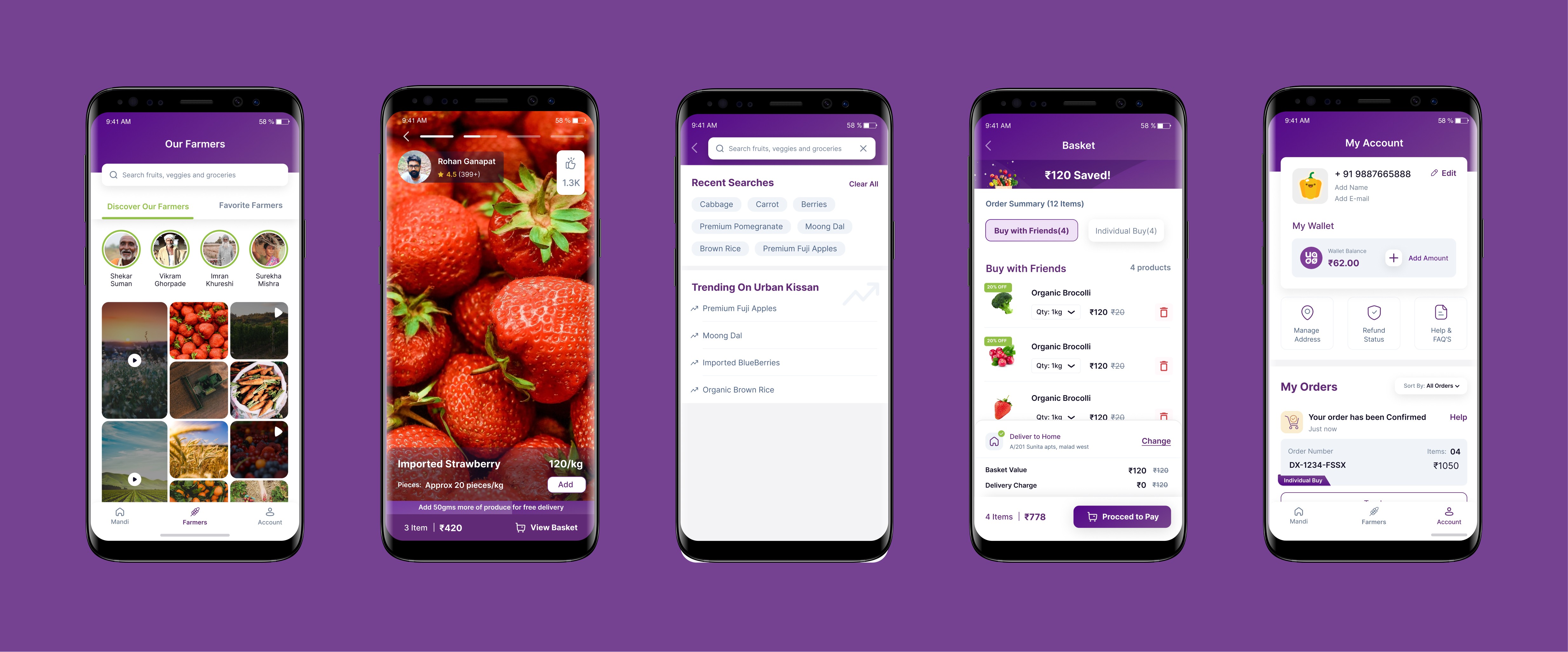 The screens below represent the final designs that shaped the Urban Kisaan app experience — laying the foundation for a transparent, farmer-first shopping journey.